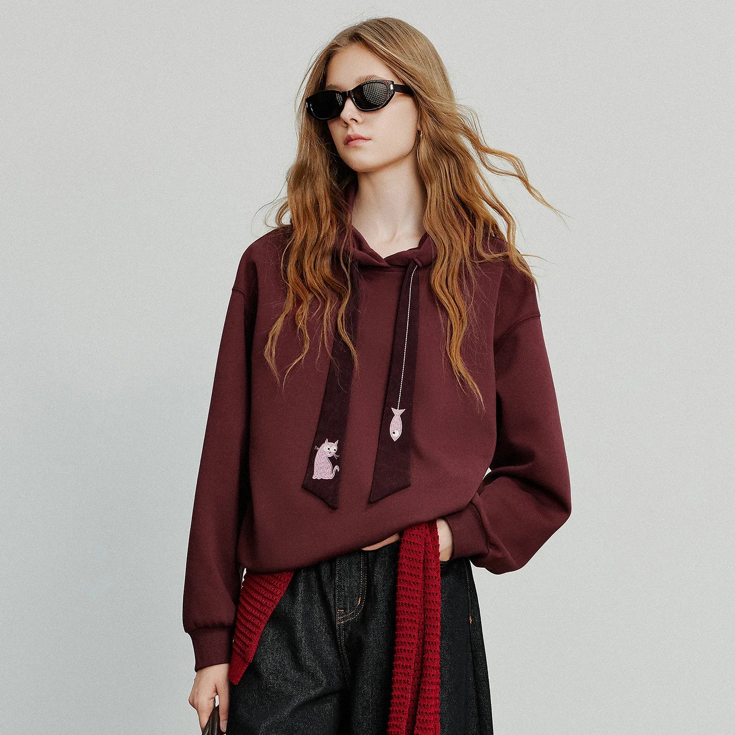 TOYOUTH Women Hoodies Sweatshirt 2025 Autumn New College Style Cat Embroidery Tie Cotton Hooded Pullover Tops