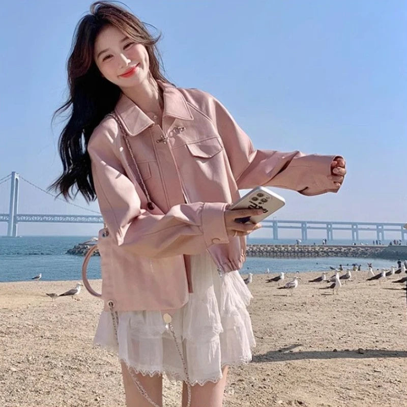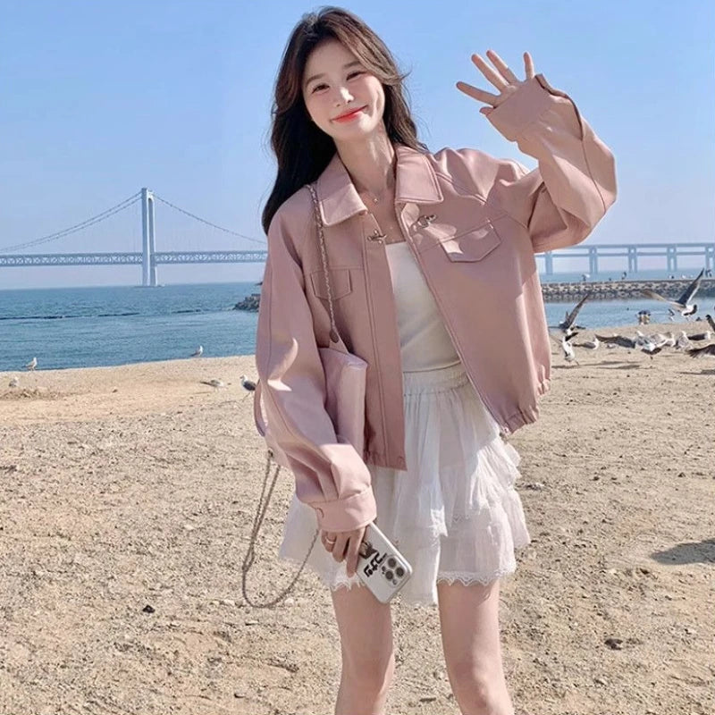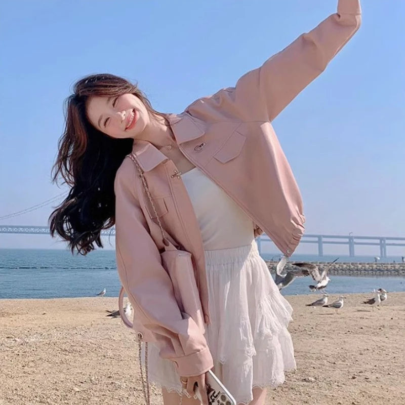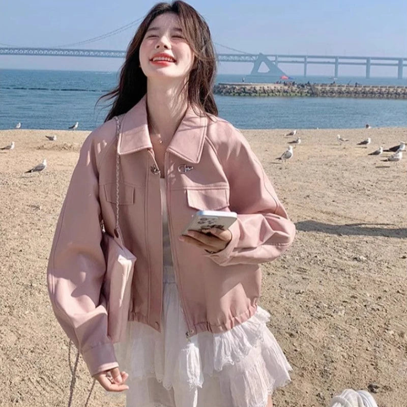 Women's Short PU Leather Jacket Pink Spring Autumn 2025 Sweet Cool Street Style Slim Fit Harajuku Fashion Biker Jacket
